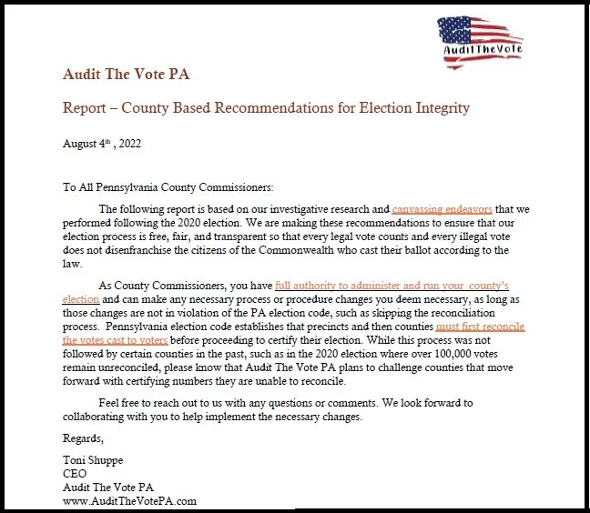 Reports 2022 Election Recap Report Link To Report Here Link To Full Report Here County Based Recommendations for Election Integrity NCOA Report on Voter Registrations Prior to 2022 Mid-terms Link To Full Report Here Unverified Mail-in Ballot Report Link To Report Here
